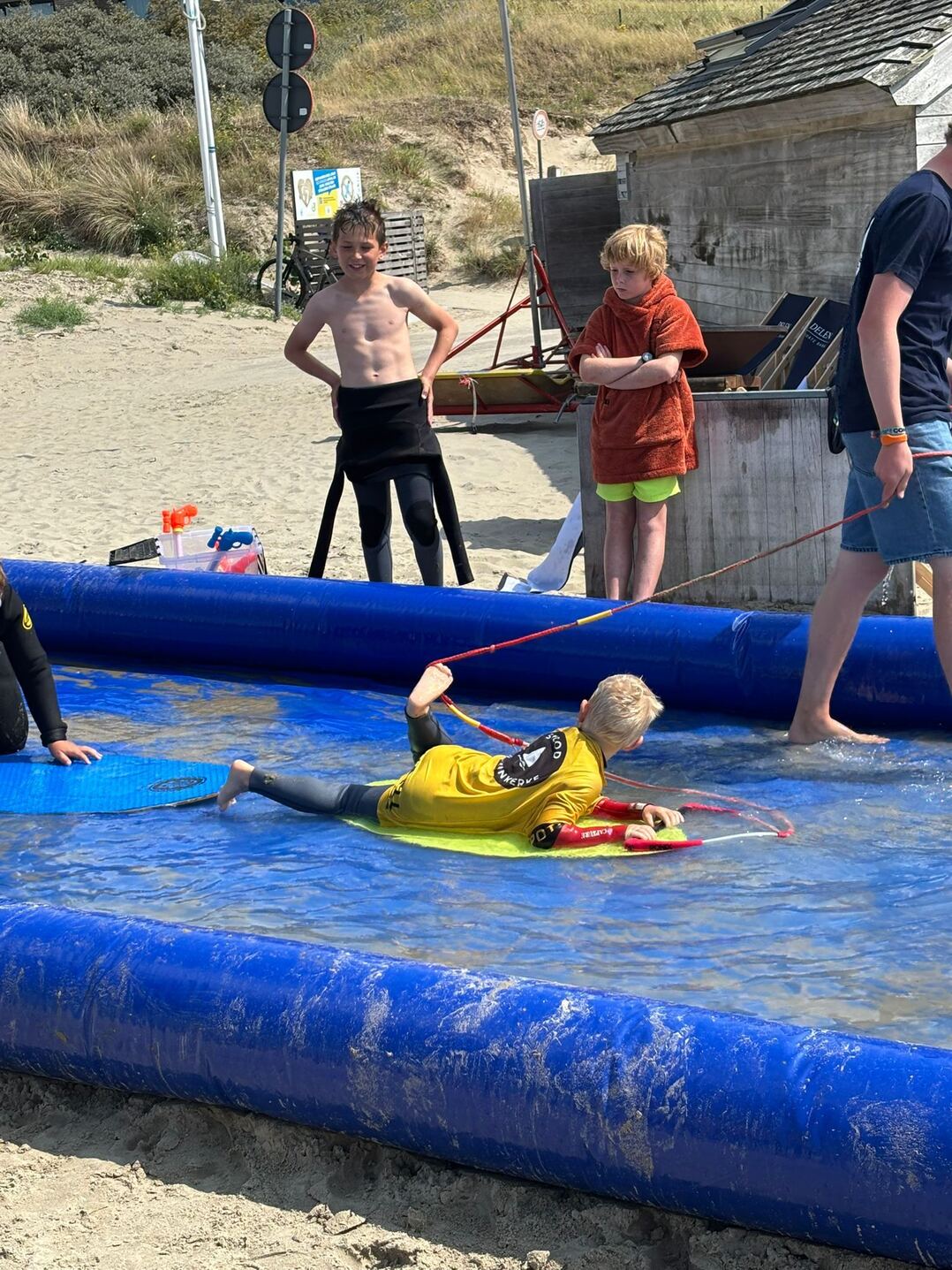 2. De douches mogen niet gebruikt worden met zeilkledij aan omdat het zand de afvoerleidingen verstopt. Kledij kan afgespoeld worden met de tuinslangen of buitendouches.
